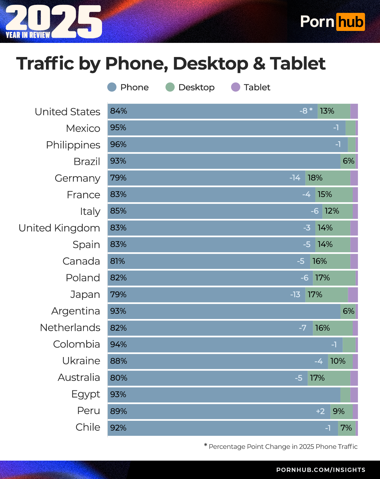 Otherwise, there were no major changes in traffic by country. Overall, the top 20 countries make up 77.5% of all daily traffic to Pornhub. Pleasure is truly a global pastime.