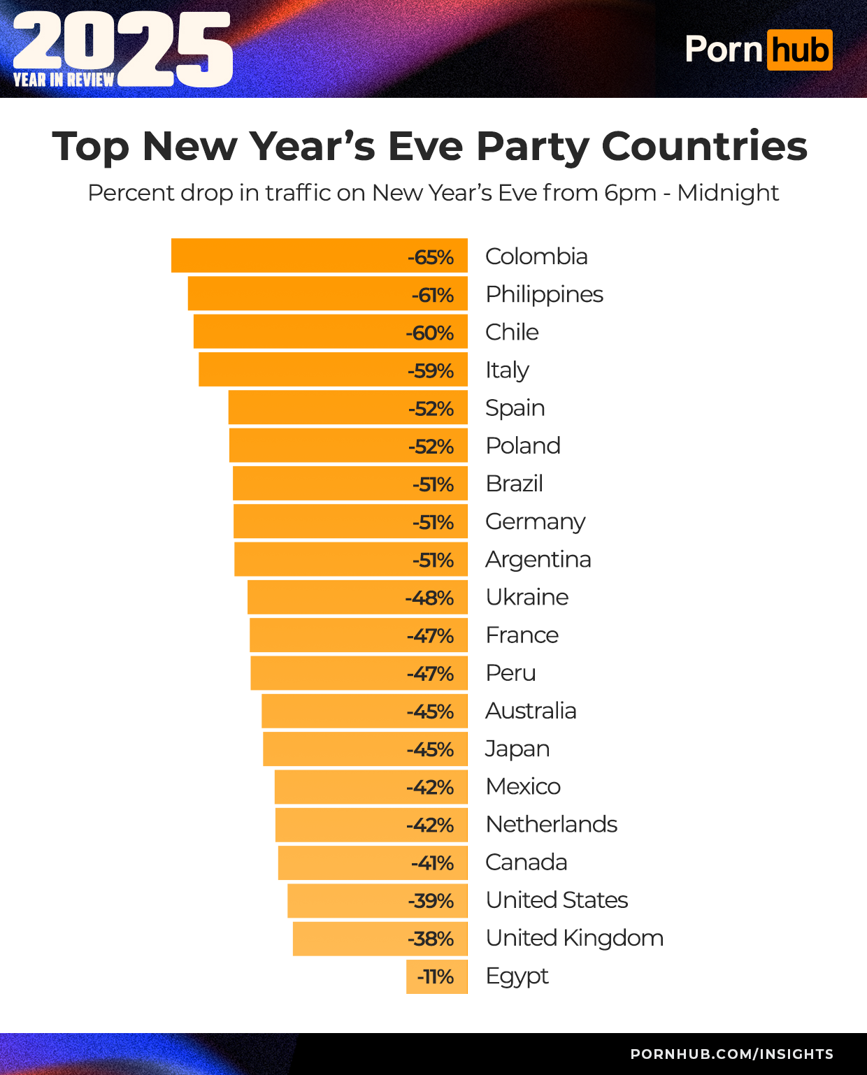 Finally, Pornhub’s highest point of traffic in 2025 was January 5, at 11pm, when the world came together. Why? We asked. There were several factors that could contribute to the high traffic. 1) The Golden Globes ended at 11pm that night. 2) The Lions vs Vikings football game ended at 11pm that night. And 3) There was a big winter storm across much of the United States, which meant more people were at home, indoors. Together, it created the perfect conditions for high traffic to people’s favorite site to end the night.