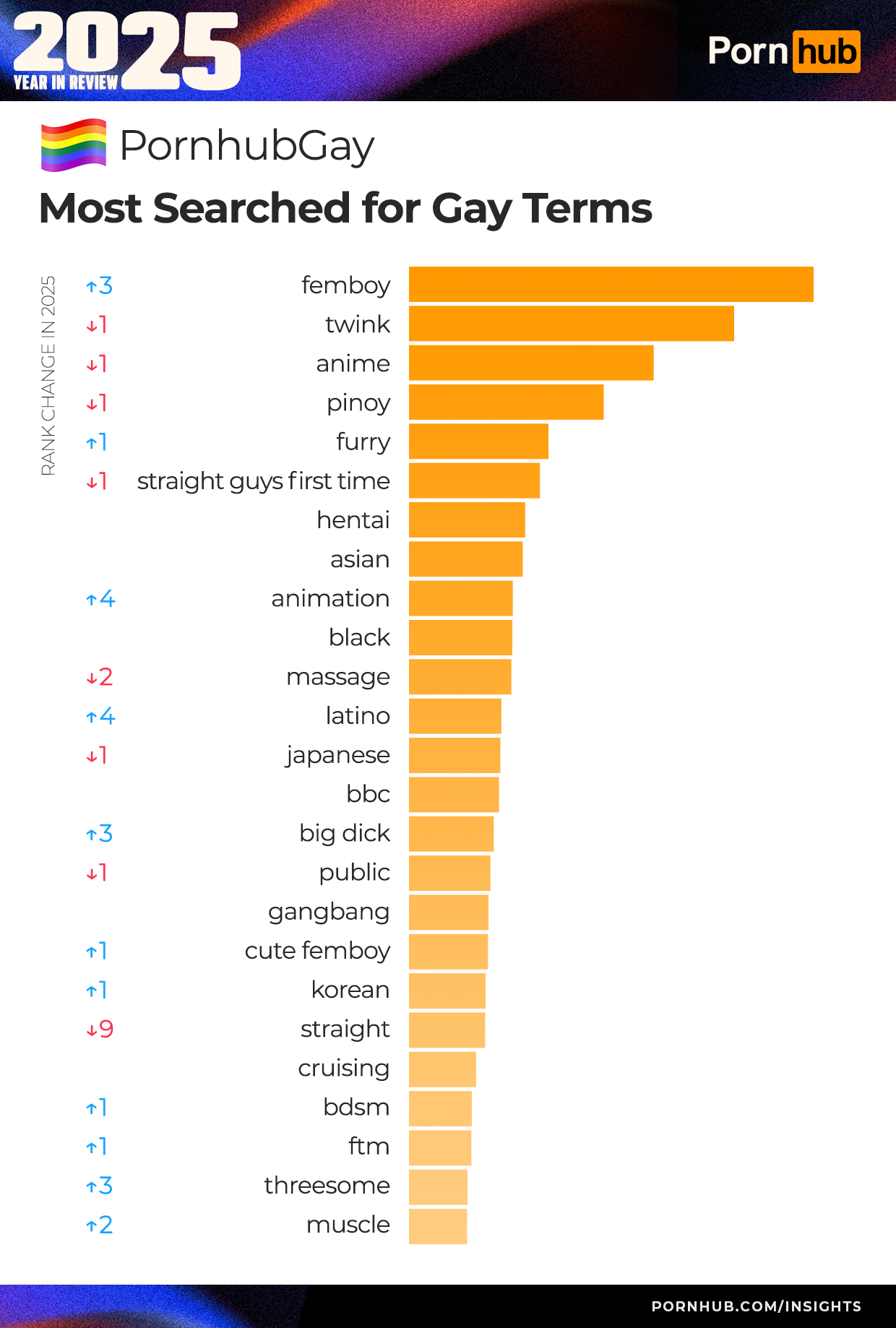 Noticeable changes in popularity this year include “femboy” which jumped up +15 places, landing in the 10th top searched term. This aligns with one of the growing trends this year, as more and more people are searching for content showing feminine adult men.