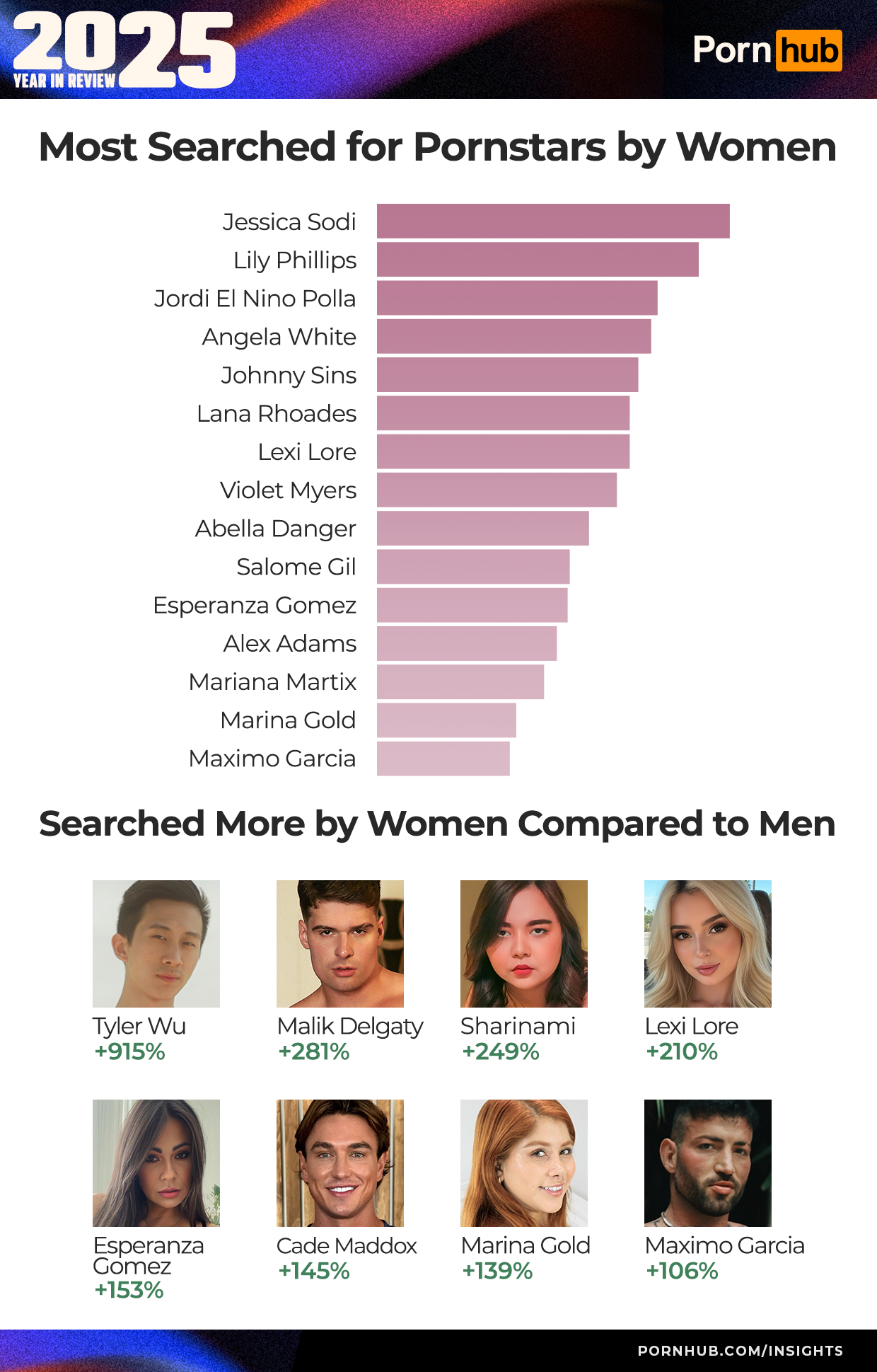 Explore our graphs and detailed summaries to discover how the world’s porn viewing habits unfolded in 2025. Whether you browse from start to finish or jump between the sections linked below, you’ll uncover how the gender gap influences interests, which states and countries have distinct preferences, the destinations that came to Pornhub most, the video game characters sparking new fantasies, and plenty of other surprises!