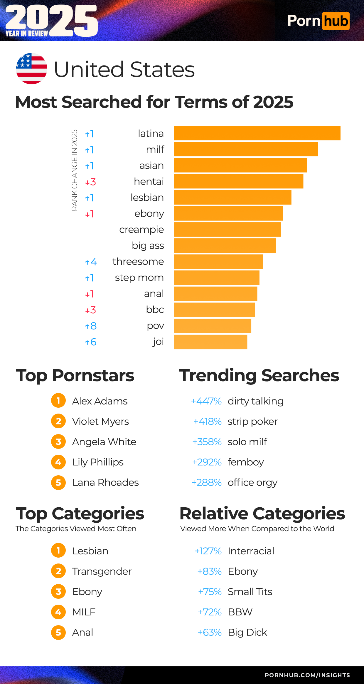 The top searched terms of 2025 within the United States saw a lot of shuffling this year. Latina was the top searched term in the US, dethroning “hentai” which dropped –3 spots, “milf” jumped to 2nd top searched term, and “asian” to 3rd.