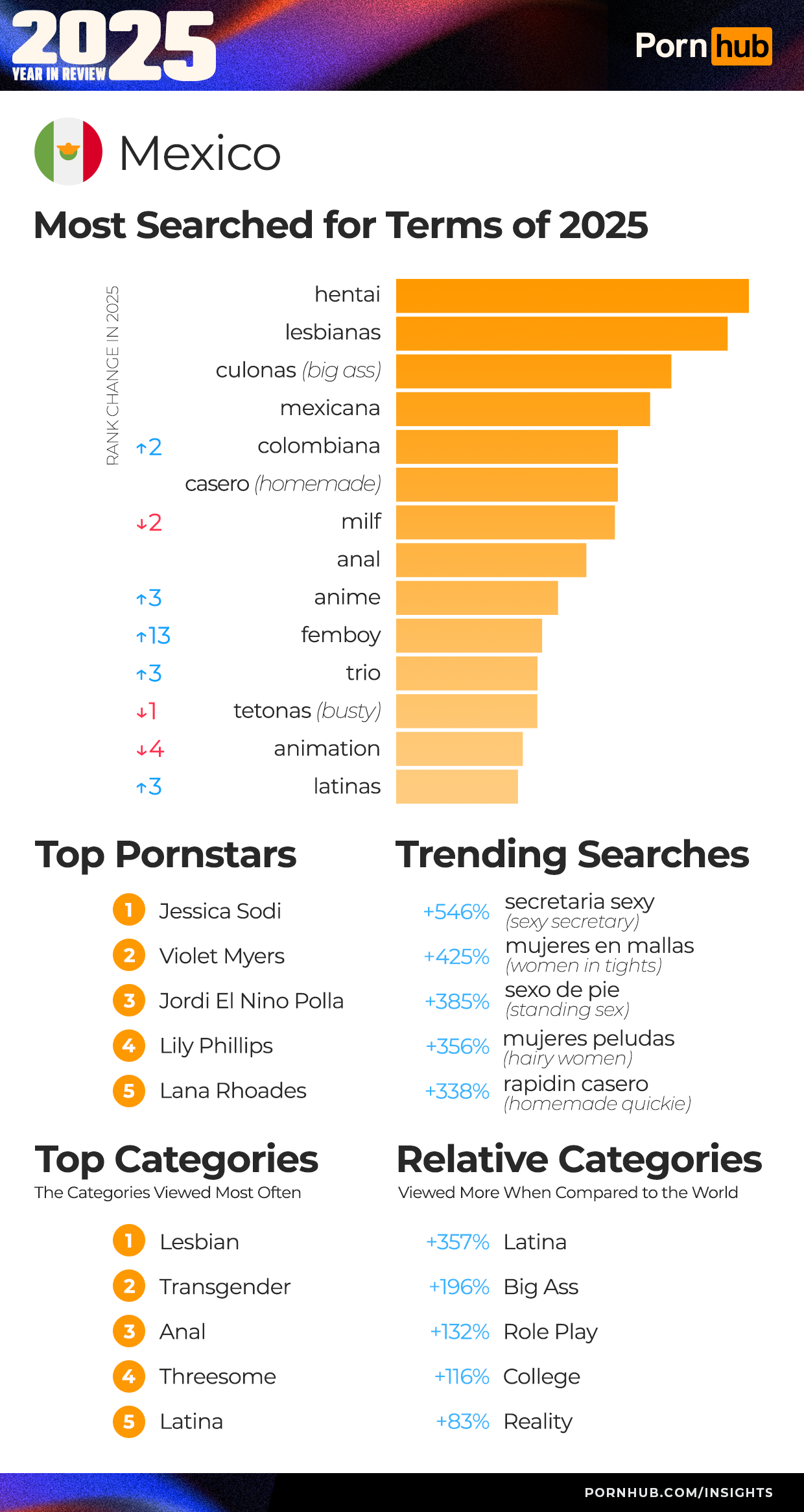 Argentina’s top search terms didn’t change much this year. Searches for “argentina” took the lead again this year by a landslide, followed by “hentai” in 2nd, “lesbianas” in 3rd, “milf” in 4th, and “anal” in 5th, up +2 spots from last year. Following 2025’s defining trend of femboy interest, the term also jumped +5 spots in Argentina this year. “en español” also saw an increase of +7.