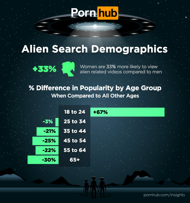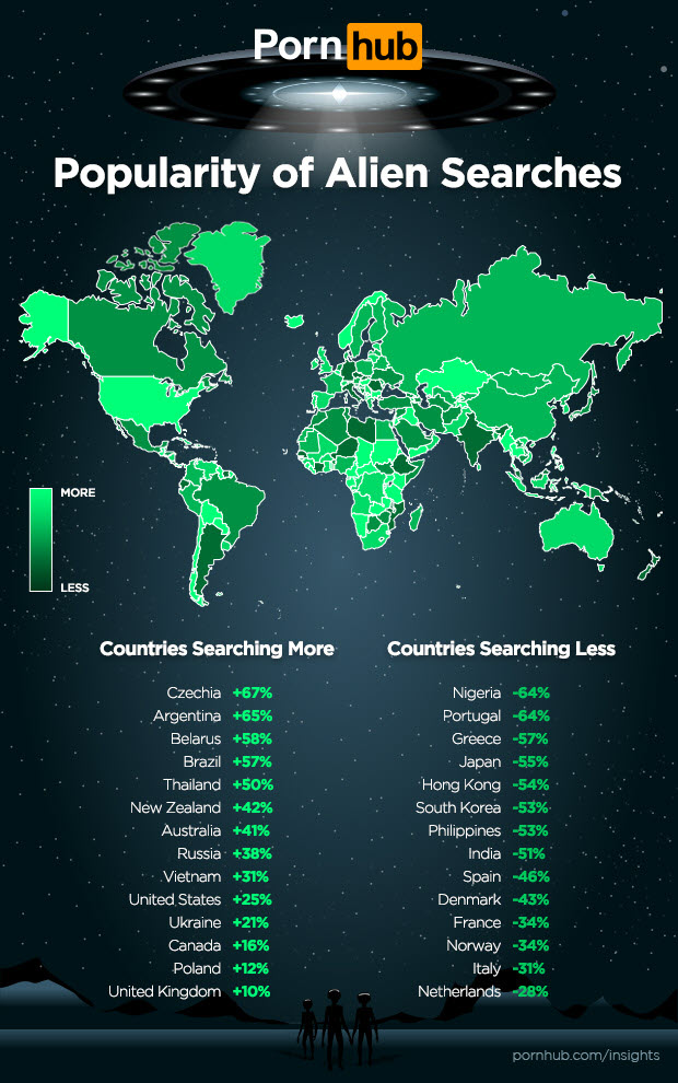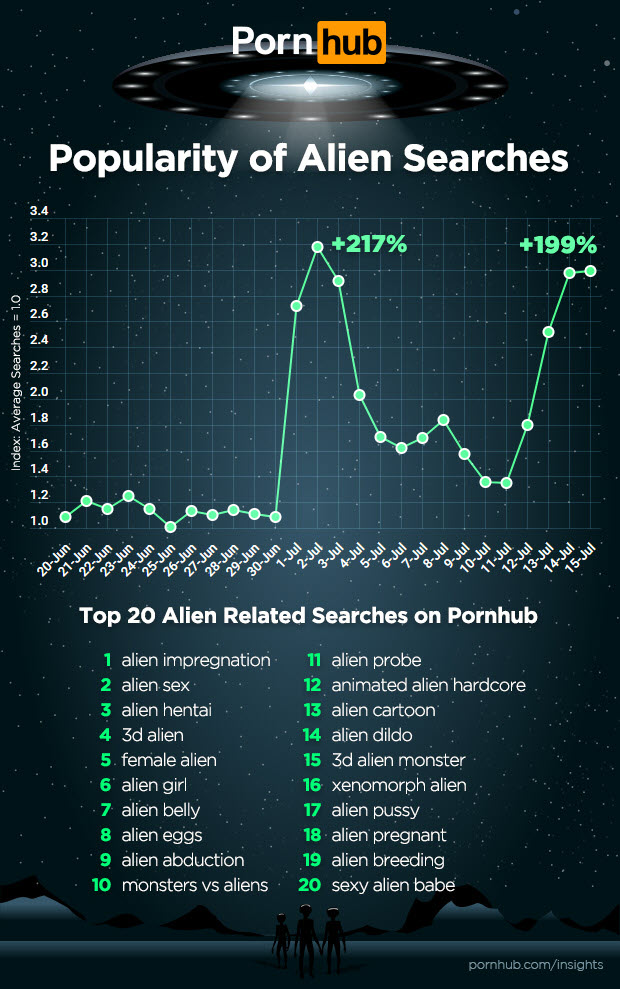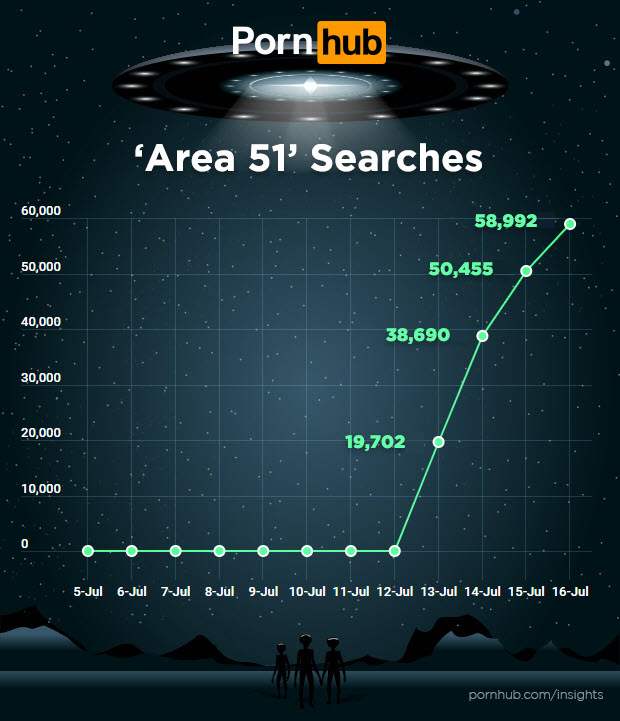 Thanks to a Facebook event called “Storm Area 51”, 1.5 million people have RSVP’d their interest in breaching the top secret military base in Nevada to find out what’s really been going on there. It’s hard to say if anyone will actually show up and defy the U.S. government, but Mashable asked if this has had any effect on Pornhub’s searches. Our statisticians soon found out that thousands of (on-planet) visitors are already preparing for an extraterrestrial encounter by checking the ins and outs of alien sex on Pornhub.