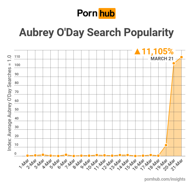Another O’Day, another Trump O’fair. While Stormy Daniels searches are still on fire, today it’s presidential son Donald Jr. who shares the news for his alleged affair with former Celebrity Apprentice contestant Aubrey O’Day. While Aubrey enjoyed a small but consistent number of daily searches on Pornhub, her search popularity shot up 11,105% after the story came out, and continues to rise.