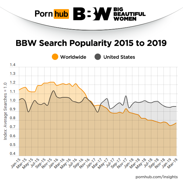 Pornhub Insights last took a detailed look at BBW searches (aka Big Beautiful Women) way back in 2015. In the meantime, BBW (NSFW) searches have continued to appear in numerous Insights posts like our annual Year in Review and niche topics like Feeder Fetish. MEL Magazine asked us to take a more detailed look at what keeps big women hugely popular on Pornhub.