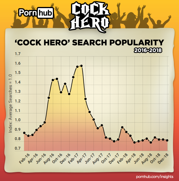 “Cock hero” videos are popular enough that they’re searched an average of 800,000 times each month, with more than 10 million “cock hero” searches in 2018. Some of the top “cock hero” videos have been viewed millions of times. Search popularity peaked in March of 2017 when the most recent Rock Band VR game was released. Searches that month totaled more than 1.2 million.