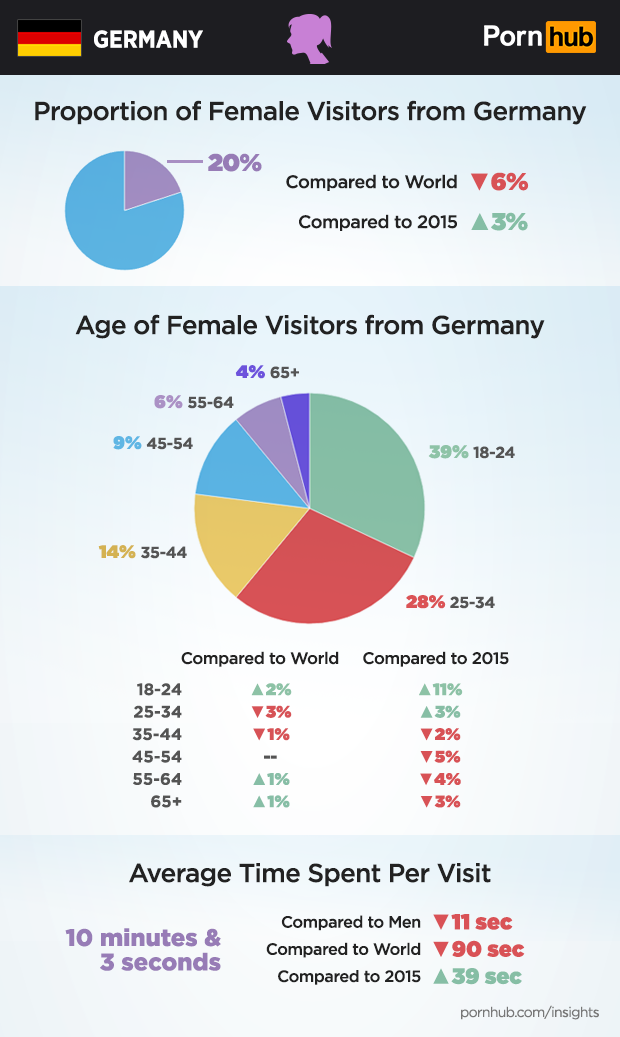 In today’s Insights report, we’re once again focusing on the preferences of Pornhub’s female visitors — this time from Germany. The proportion of Germany’s female visitors is relatively low at only 20% compared to the world average of 26%, but we have seen an increase of 3 percentage points over the last 2 years.
