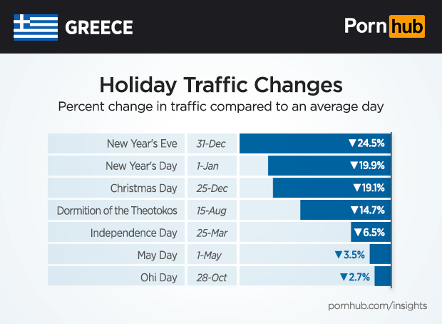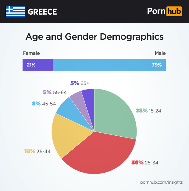 In this edition of Pornhub Insights we’re taking a look at the current porn habits of the Mediterranean country of Greece. We last looked at Greece back in 2015, so the folks at Lifo.gr checked in to see how Greek porn preferences have changed since then. While overall traffic from Greece has increased, the rank has dropped from 21st worldwide to 24th. This is mostly due to growth in other countries as seen in our last Year in Review.