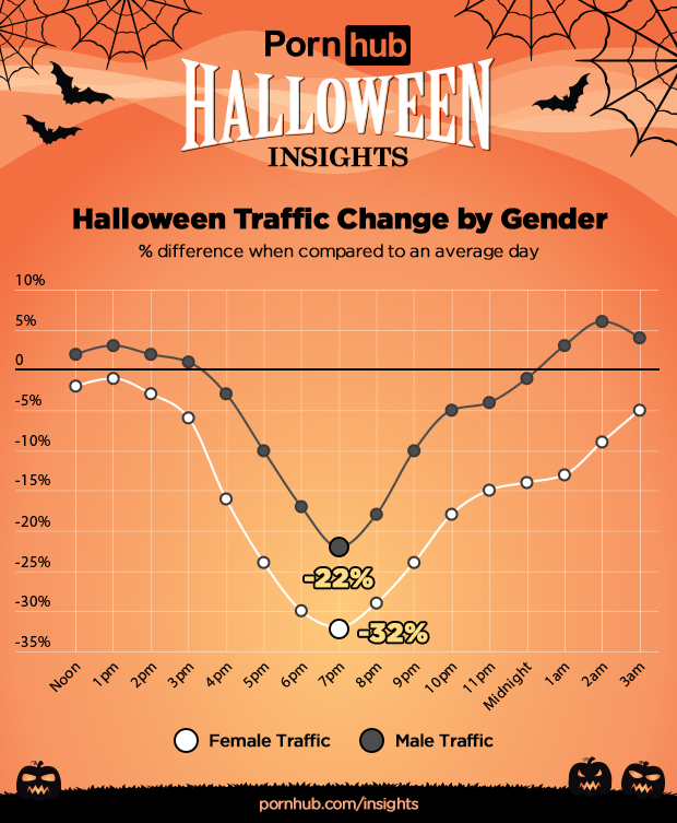 American women are more likely to give up Pornhub in favor of Halloween with female traffic dropping by -32% at 7pm on January 31st, compared to a -22% drop in traffic from men.