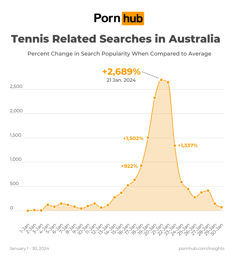 The Australians were so focused on the sport, during the competition tennis related searches in the country soared to an incredible +2,689% on the 21st of January.