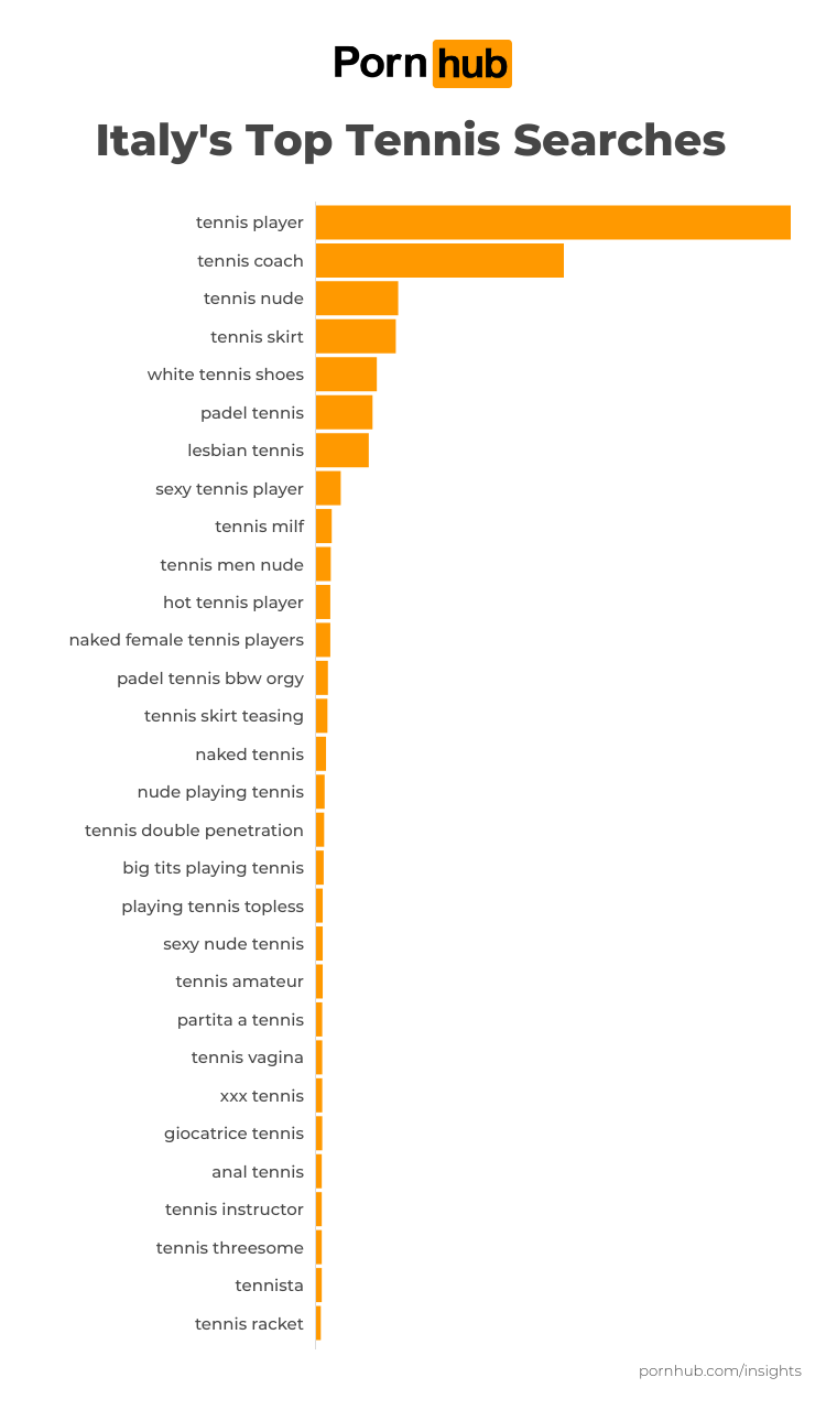 But what exactly did Italians look for on Pornhub? First was a generic “tennis player” followed by “tennis coach” and “tennis nude” and then “tennis skirt.” After that, viewers got a little more creative with their variants related to the sport, including “white tennis shoes” and “lesbian tennis.”