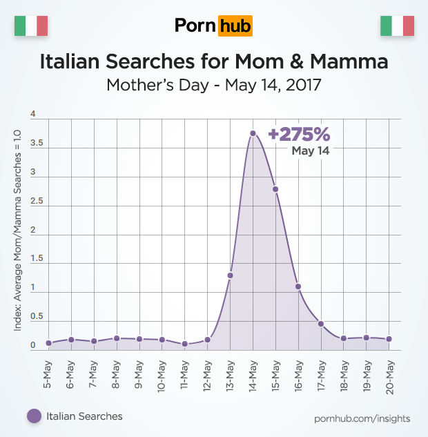 Many holidays such as Thanksgiving and Easter will cause related searches to increase, and MILF’s Day is no exception. On Sunday May 14, 2017 we found that searches containing Mom and Mamma (that’s the Italian word for Mum) increased by 275% in Italy, which is a very significant amount considering the popularity of these two terms. In fact, ‘mum’ is the 3rd most popular search term in Italy.