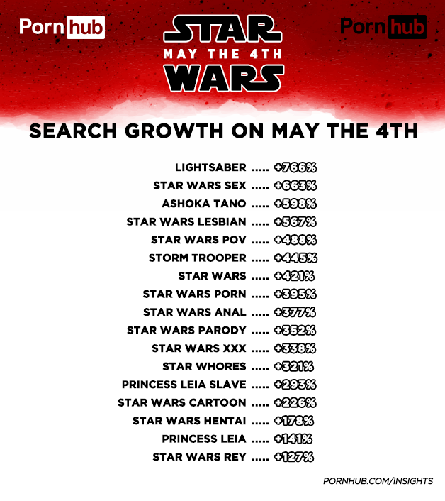 In particular, searches for “lightsaber” gain an impressive 766%, “star wars sex” 663% and “ashoka tano” 598%. Those are based on results from May the 4th, 2017.