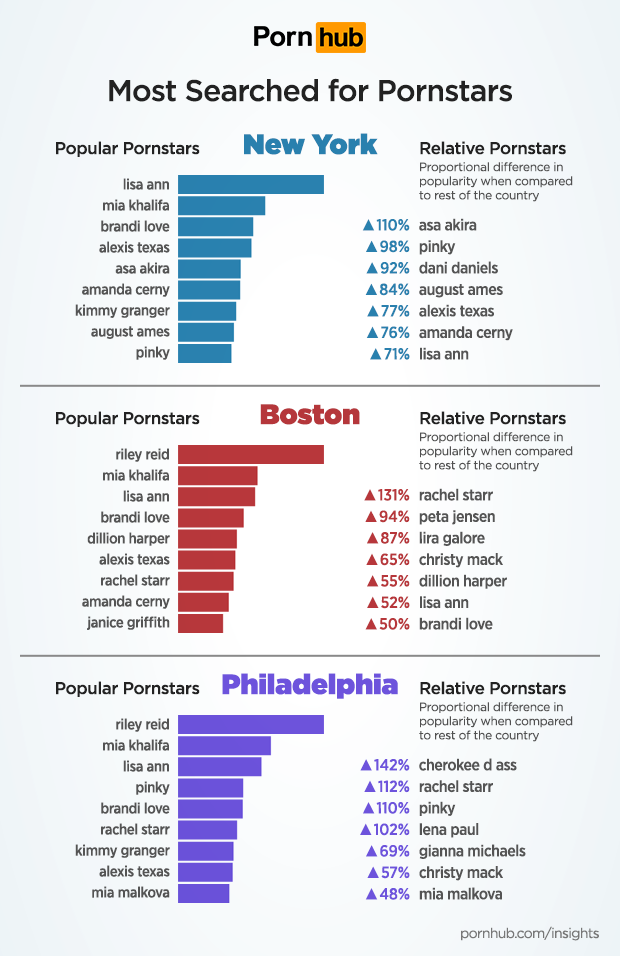 Lisa Ann is the most searches for pornstar in New York, while Riley Reid takes the top spot in Boston and Philadelphia. In New York, Asa Akira is 110% more popular than elsewhere in the U.S., while Boston sees a 131% increase for Rachel Starr and Philadelphia goes for Cherokee D Ass 142% more often.