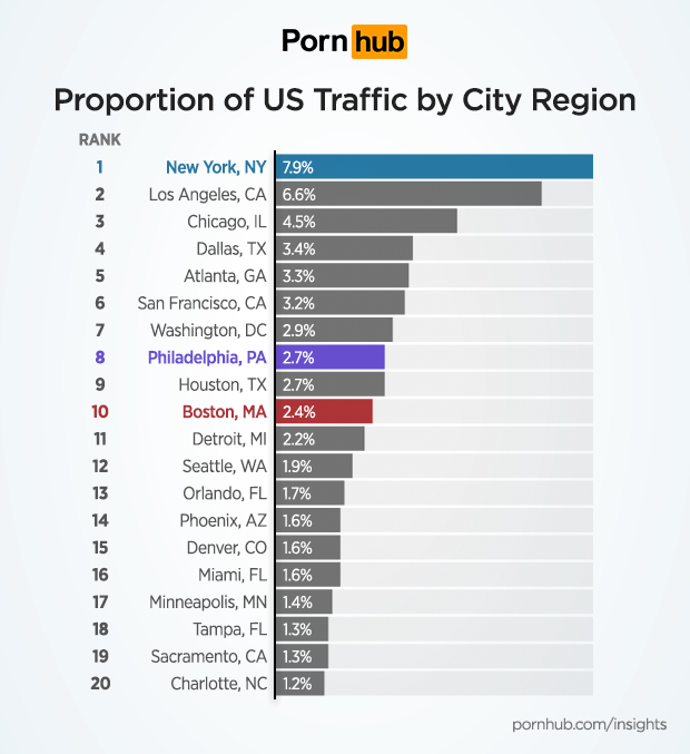 In this edition of Pornhub Insights, we’re joined by our friends at Metro US to look at the porn viewing habits of three of the largest cities in the United States. New York city accounts for nearly 8% of all U.S. traffic, while metro area Philadelphia ranks 8th with 2.7% of traffic and Boston at 10th with 2.4% of U.S. traffic. Visitors from New York and Boston both spend about 17 seconds less time on Pornhub compared to the national average visit time of 10 minutes 26 seconds, while visitors from from Philadelphia manage to hold out for 8 seconds longer.