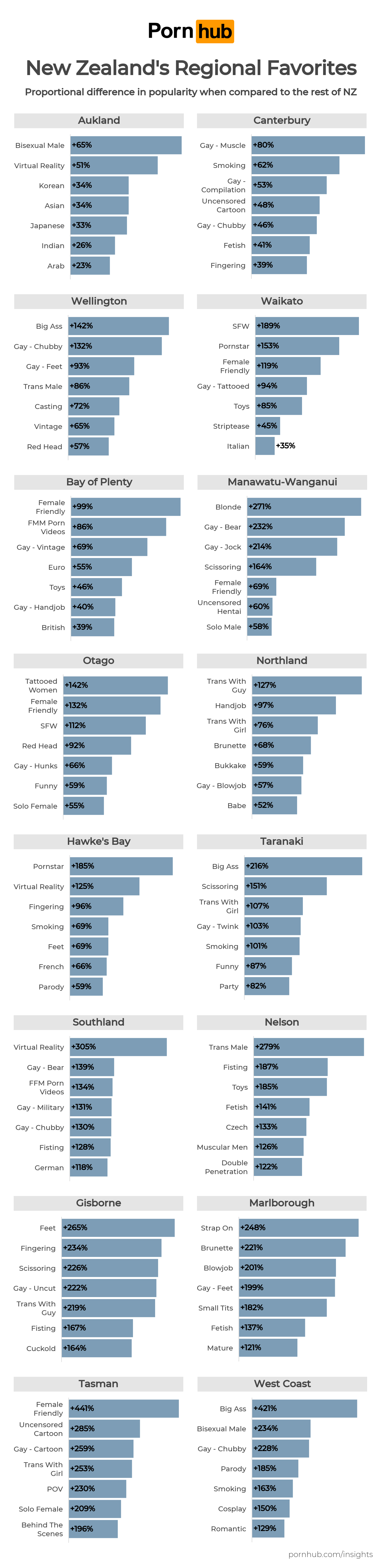 The following chart illustrates the top relative search terms for each region of New Zealand, when compared to the rest of the country. For example, Waikato is more likely to search for “Maori”, Bay of Plenty for “Pillow Humping”, Southland for “Creampie” and Otago for “Bikini”.