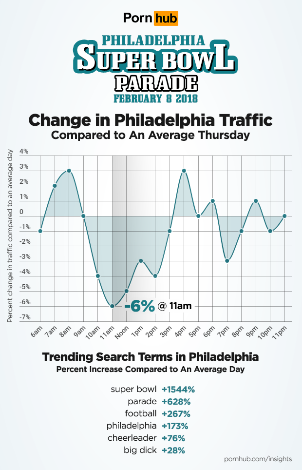 Hot on the heels of our 2018 Super Bowl Insights, Pornhub’s statisticians focused in on Philadelphia’s traffic change during their February 8th parade celebrating the Eagles’ win. While traffic from the city of brotherly love was up slightly before 9am, it began to drop by 10am as fans headed to the chilly streets to find a good view. By 11am, traffic was down -6% below that of an average Thursday, and as the celebrations continued, traffic remained below average until 3pm at which time there was a slight increase above average.
