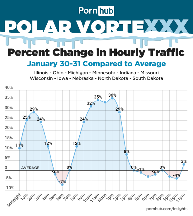 Record highs happened in Minnesota where traffic to Pornhub increased by +22% above average on January 30th to 31st. Wisconsin traffic was up +12% and +9% in both Indiana and Illinois.