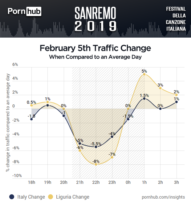 As soon as the festival started, the traffic suddenly dropped down, with the biggest drop around 10 p.m.(-5%) while Andrea Bocelli was performing. At the same time Ligury (the region that hosts the music festival) experienced a -8% drop.