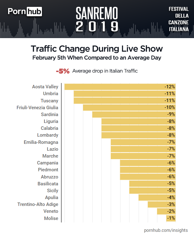 Our statisticians discovered that compared to an average day, Italy’s traffic started to drop shortly after 7 p.m., probably because people were starting to prepare for the live show.