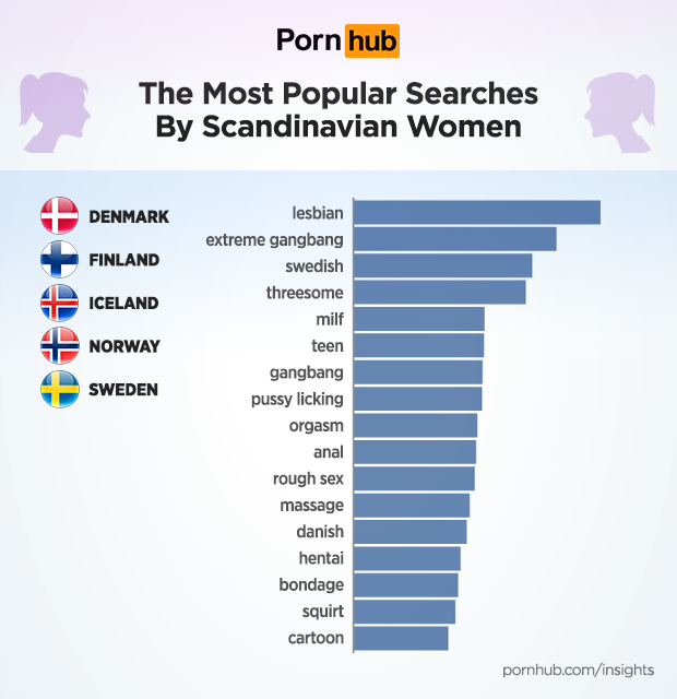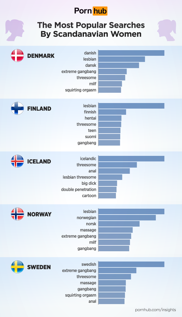 Like elsewhere in the world, Scandinavian women search more often for “lesbian” porn, followed by “extreme gangbang”. Searches for “Swedish” come in 3rd, and “Danish” also makes the list of top searches across the region.