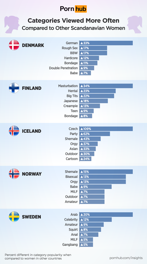 27% of Pornhub’s visitors from Sweden, Norway and Iceland are women — matching the worldwide average. In Finland, 26% are female, and Denmark 25%.