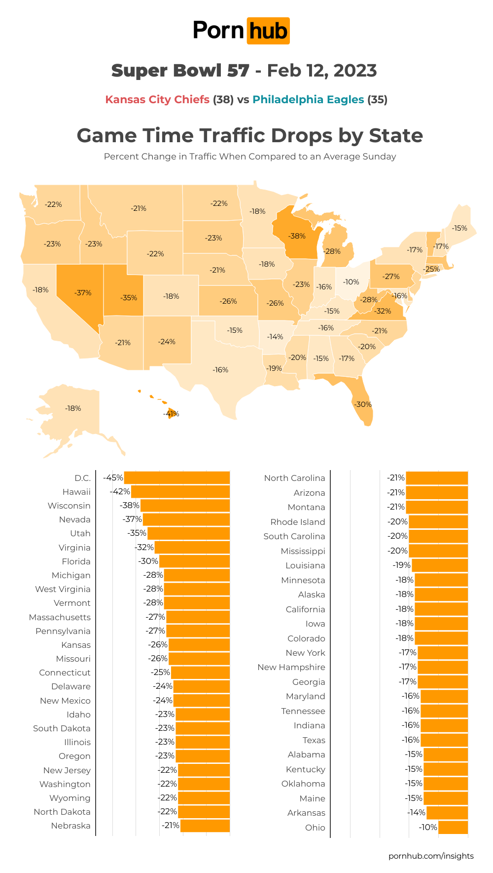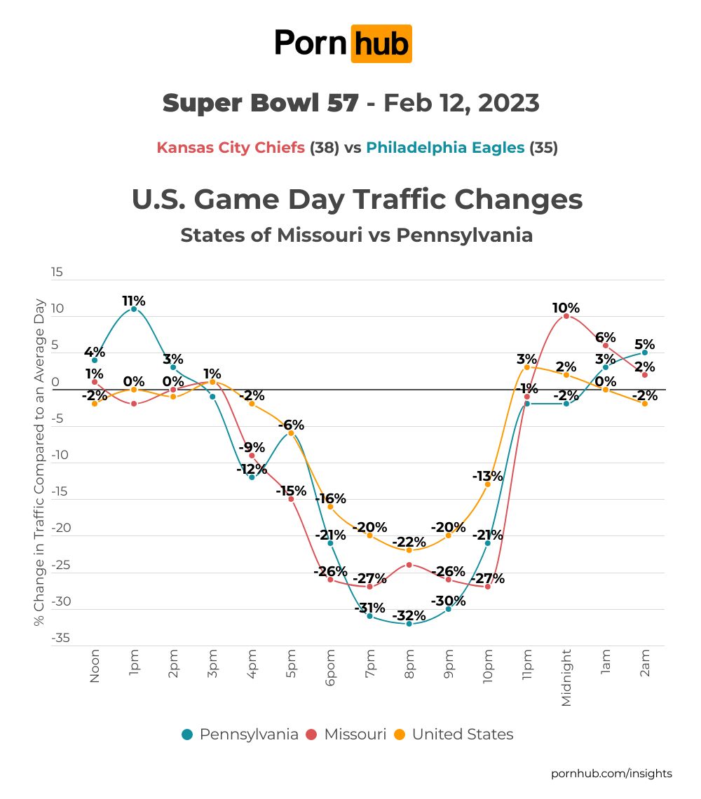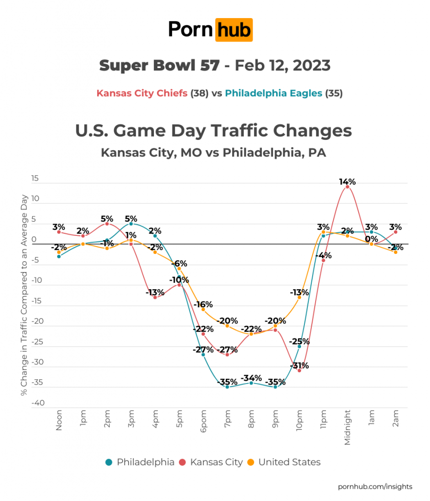 In stark contrast to this, the rest of the United States as well as Kansas City dropped to only -22% around 8pm, while Philadelphia retained a consistent -34% drop. This was during the halftime show. This tells us that while 12% more of the rest of America took that time to visit Pornhub, Philadelphia stuck around to watch the halftime show uninterrupted!