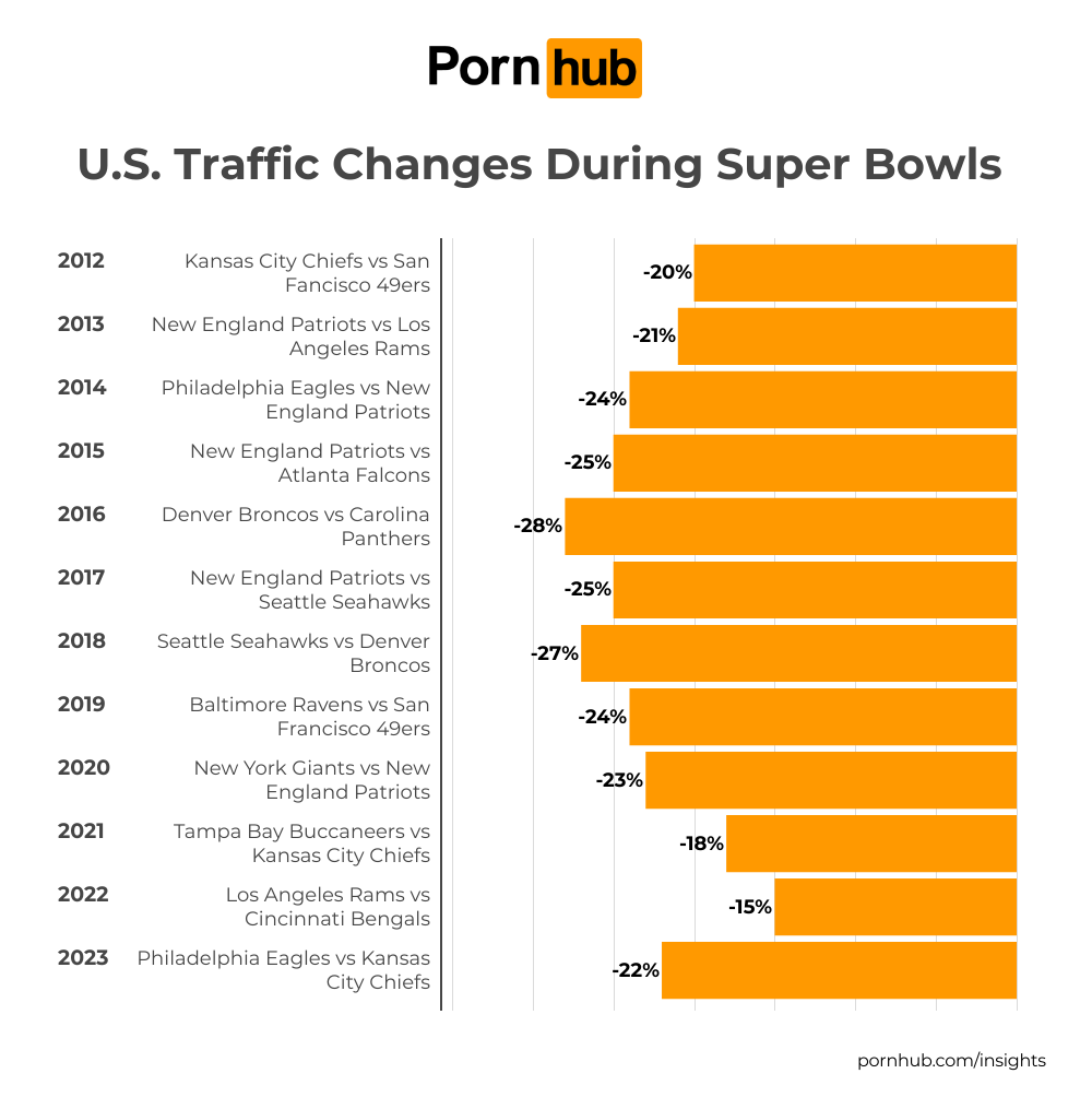 Since 2019, those numbers have started to drop, meaning fewer people were interested in the game and Pornhub saw lower drops in traffic on game day. In 2019, traffic dropped -24%, 2020 traffic dropped -23%, 2021 traffic dropped -18% and then 2022 saw the lowest drop of the last decade, with a small drop of -15% when the Los Angeles Rams played the Cincinnati Bengals.
